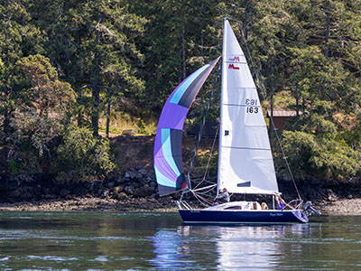 “We were going to go counterclockwise, but I kept looking at the wind coming down San Juan Channel and there was no wind ahead to the east. We started going east but I kept looking at that northerly breeze and changed my mind and off we went clockwise,” said Betsy Wareham, skipper of Purple Martin. “We set the kite going into Wasp Passage and kept to the Shaw shore until Horton’s Hook then jibed out past Bell Island reef. We had breeze until just past Broken Point where we ran into converging winds. The easterly won out and we were moving again, but, uh oh, here came the leaders of the