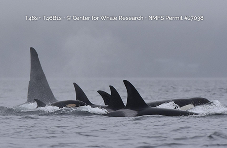 The team spotted another group of whales to the northwest. The team stayed with the T46s for a few minutes as they began to catch up to this northern group, before putting ahead to catch up with these other whales. This second group was the T46B1s, with their newest calf, T46B1D, travelling in echelon with older sister T46B1A.