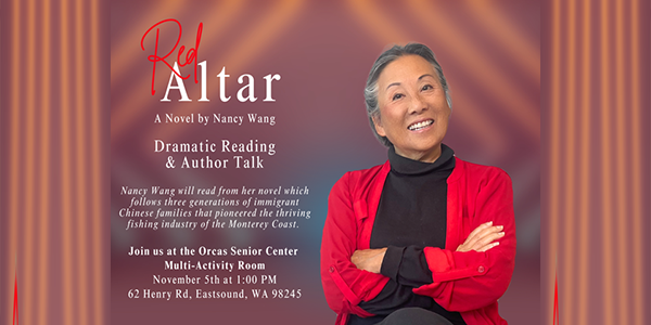 Join Nancy for a dramatic reading of a few chapters, a Q&A and the chance to buy her book on Wednesday November 5th at 1-2:30 at the Orcas Sr. Center.