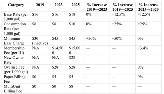 EWUA Rate Changes and Percentage Increases (2019 → 2023 → 2025)