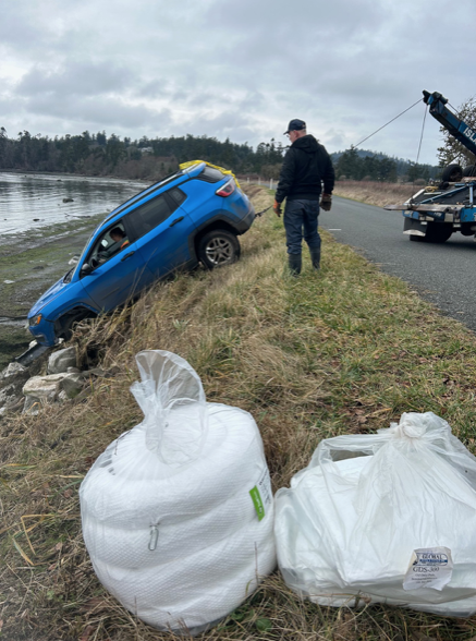 2025 January 7: Most of IOSA’s responses involve boats, but that’s not always the case. A report of a car in False Bay on San Juan brought Deputy Director Rick Winings out with absorbents and other gear, ready to deal with a car-sized spill. Fortunately, no spill occurred, and the Sheriff towed the car away without incident.