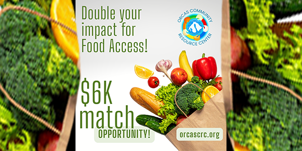 Uncertain times call for community solutions.Thomas Bridge of Island Water Taxi has joined forces with Rainshadow Solar, Crane and Orcas Island residents to double every donation (up to $6K) to the Resource Center’s Food Access program through November 21st. Your gift = 2X the impact for island food security. Be the solution–donate today at https://crm.bloomerang.co/