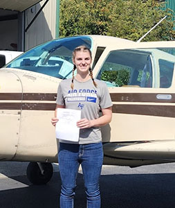 Bethany set a goal of soloing the Club’s aircraft on her 16th birthday, the first day she would be legally eligible. On the morning of her birthday in 2022, she accomplished this and then continued on to her first class at OHS. Her next goal for her 17th birthday was passing the oral examination and practical flight test to qualify for her Private Pilot License.