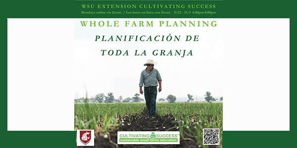 We invite you to participate in our Whole Farm Planning Course focused on Sustainable Small Farming and Ranching that will be held on Mondays, 6:00pm to 8:00pm, September 22 through November 3. Offered statewide, the course will be conducted online using the Zoom platform with in-person field trips available in regions of WA state. In addition, the course will be offered with Spanish language interpretation and facilitation.