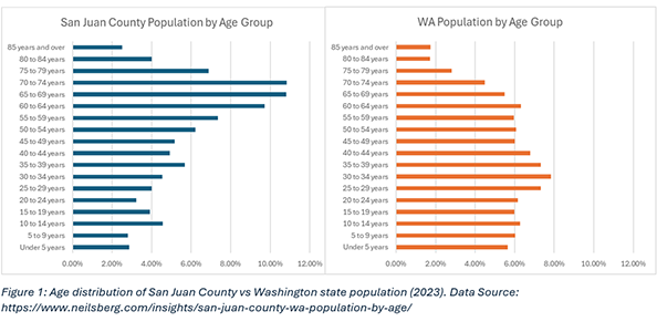 Lopez Island, like much of San Juan County, is facing demographic and economic challenges that threaten the sustainability and vibrancy of its community. The Lopez population skews elderly— with a median age of 60, even older than the county’s of 57 (Figure 1).