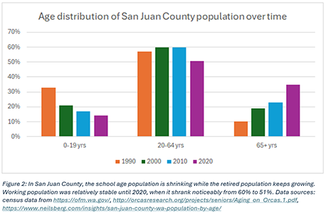Our school-age population is shrinking while the retired segment grows. As people age, they need more services from home repair to healthcare. Working age islanders Figure 1: Age distribution of San Juan County vs Washington state population (2023). Data Source who provide the many needed services like firefighting and nursing are a declining portion of the population (Figure 2).
