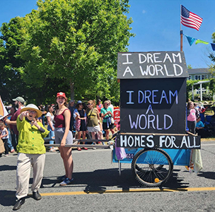 Sandy Bishop and Clauda Costa joined the Lopez Community Land Trust float in this year’s Fourth of July parade on Lopez Island, carrying a sign that said “I Dream a World [with] Homes for All.”. Photo credit: Chom Greacen