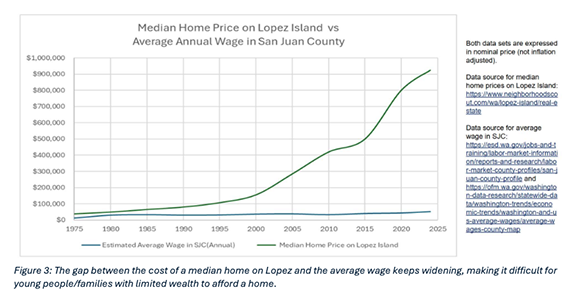 Since the 1970s, earned income for islanders has not kept pace with housing costs. Earned income has gone up about 20% since 2016, while the median home price on Lopez Island has doubled to about $957,000—equivalent to 17 years of a typical worker’s entire paychecks. This is in stark contrast to the 1980s, when a home cost about six years of earned income ($50,000) (Figure 3).