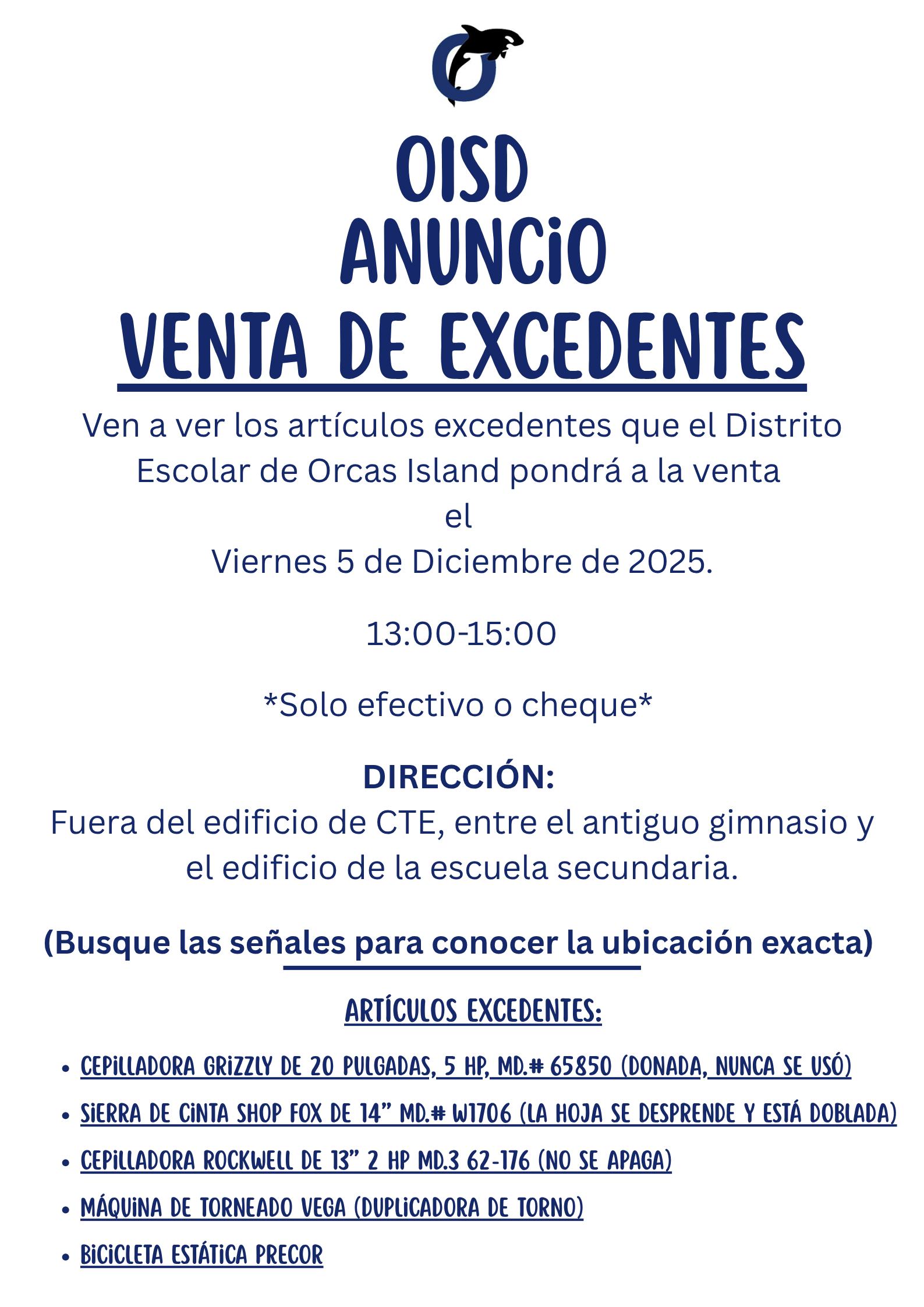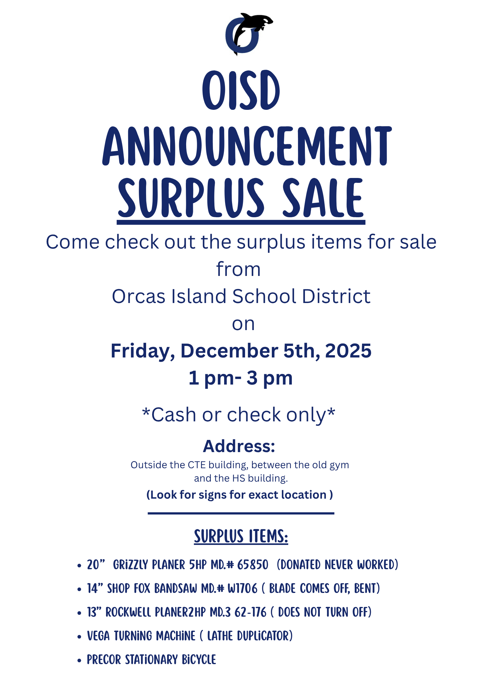 Come check out the surplus items for sale from Orcas Island School District on Friday, December 5th, 2025 from 1 pm- 3 pm. *Cash or check only* Address: 557 School Road, Eastsound WA 98245. Outside the CTE building, between the old gym and the HS building.