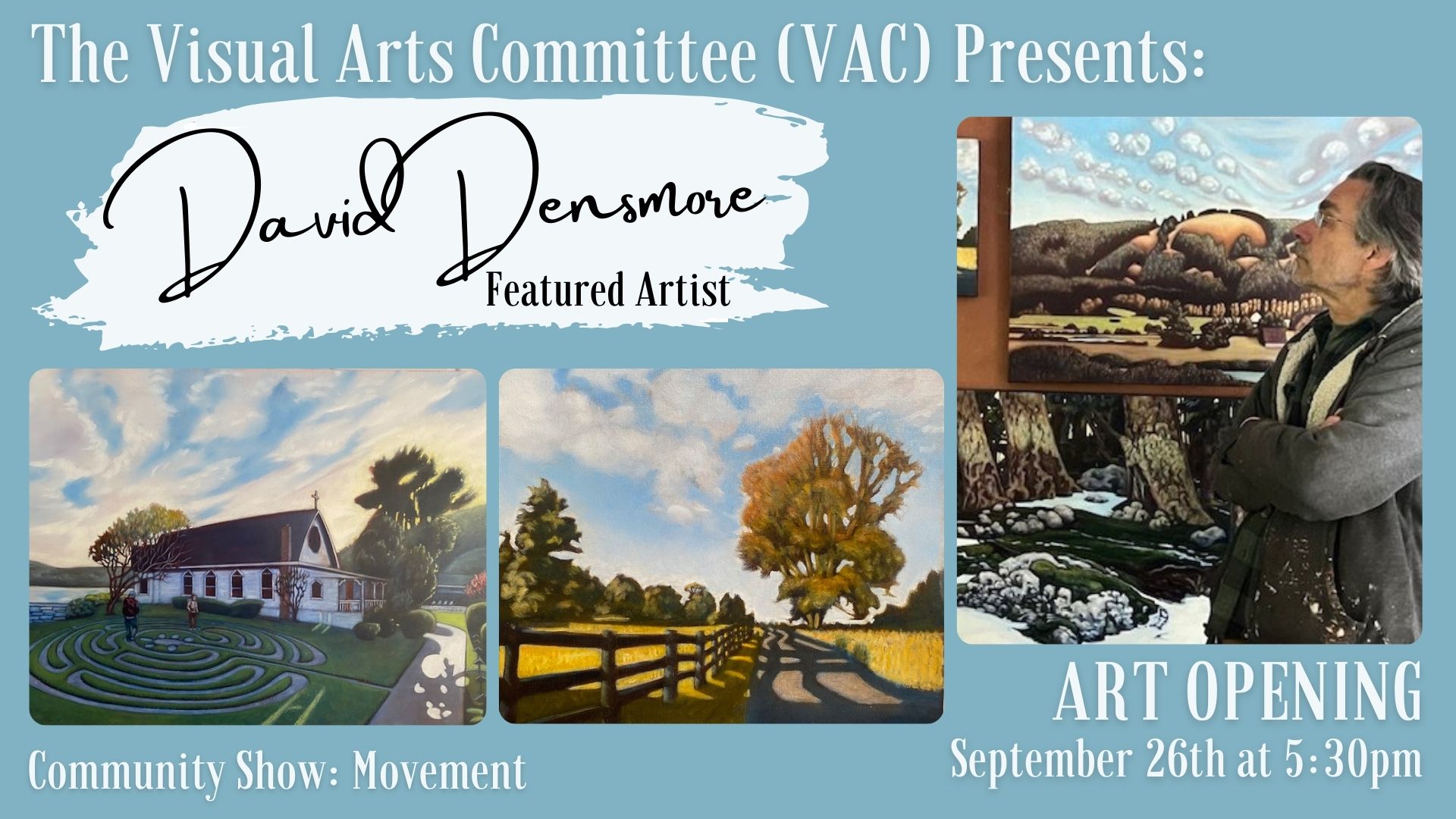 The Orcas Center’s Visual Arts Committee (VAC) invites you to the next Art Opening on Friday, September 26 from 5:30–7:00pm, featuring an Artist Talk with David Densmore at 6:00pm. This special evening will showcase Densmore’s work in the lobby gallery, alongside the community exhibit “Movement” in the Madrona Room.