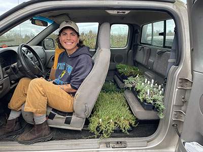 Lopez Island Field Assistant, Claire Waterman, transports plants from the Salish Seeds Project sale to Lopez Island for pick up