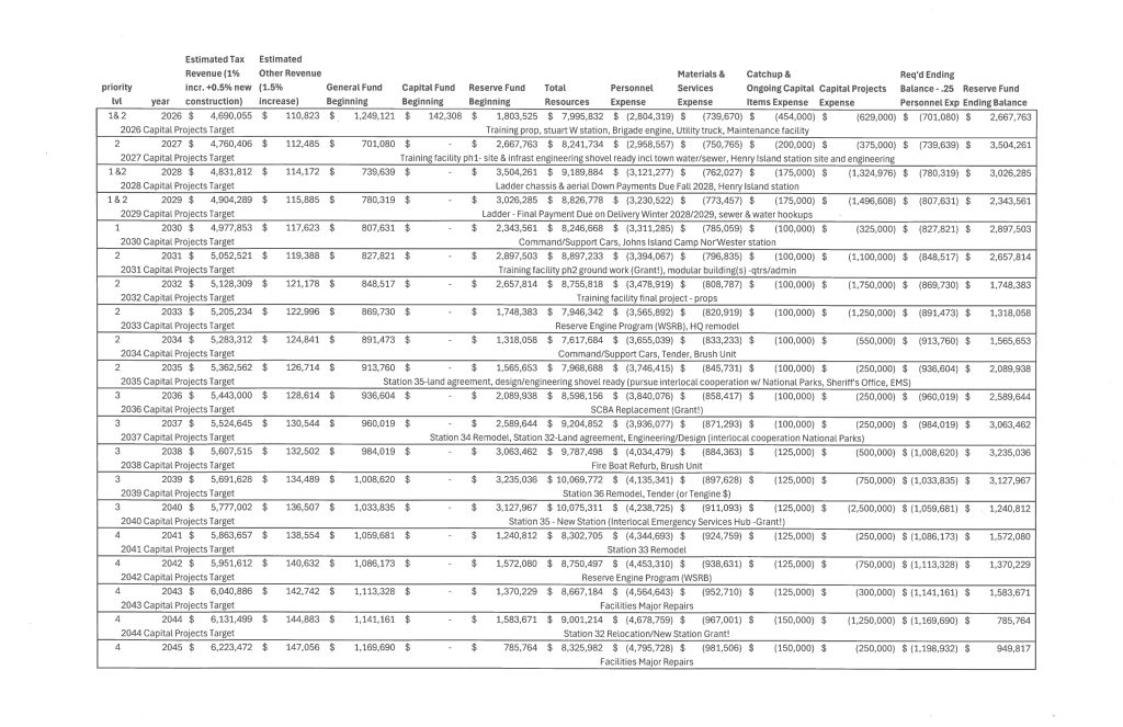 The plan provides an annual estimate which considers the listed Key Baseline Assumptions. The intent is to provide the Board of Commissioners with projected financial stability in their ongoing oversight of ensuring stable all-hazard emergency services to the public within the jurisdiction. The plan is a living document, which will require periodic review and adjustment depending on economic fluctuations that affect revenue and expenses. The plan should minimally be reviewed every five years and continued an additional five years.