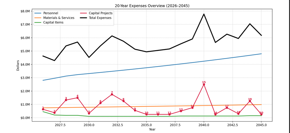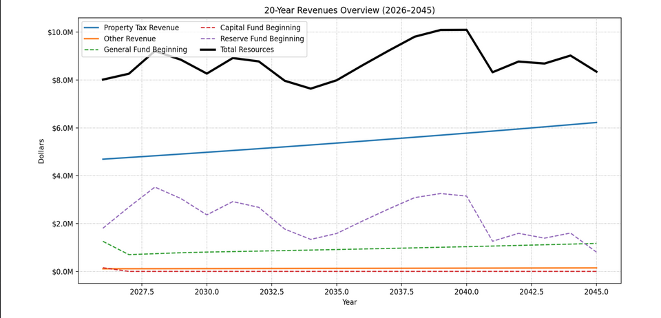 This plan summarizes projected revenues and expenditures over twenty years. All figures are based on the 2026 Budget.
