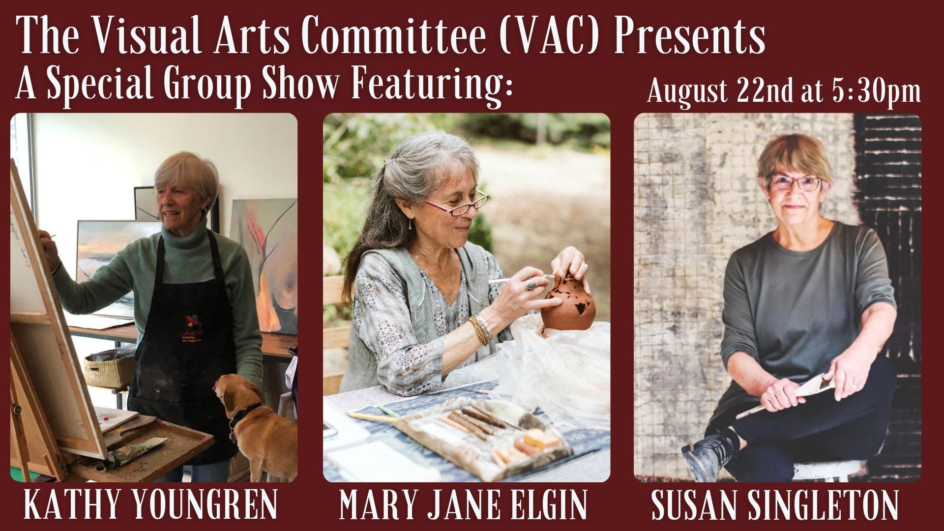 This summer, The Visual Arts Committee (VAC) of Orcas Center invites the community to an evening of art, conversation, and connection as three longtime friends – Kathleen Youngren, Mary Jane Elgin, and Susan Singleton – come together for a shared exhibition. The opening reception will be held Friday, August 22 at 5:30 pm, free and open to the public.