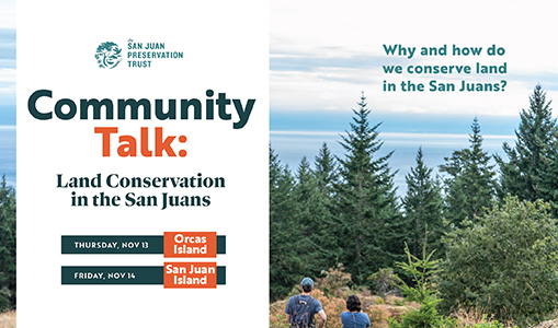 Then, on Friday, November 14, Director of Special Projects Kathleen Foley Lewis will lead the same conversation at the San Juan Island Grange in Friday Harbor. Kathleen has worked with the San Juan Preservation Trust for two decades, leading efforts to protect local species and major landscapes across the islands.