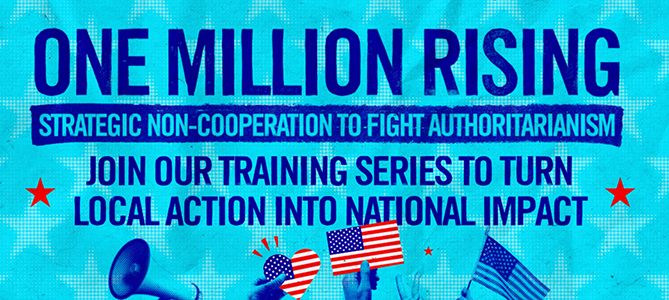 As part of Indivisible National’s No Kings call to action, One Million Rising is a call for one million people to host private in-person gatherings with people they trust. These “pods” of trusted individuals will determine their own ways of engaging in strategic non-cooperation and resistance, based on their own comfort levels and access to levers of power.