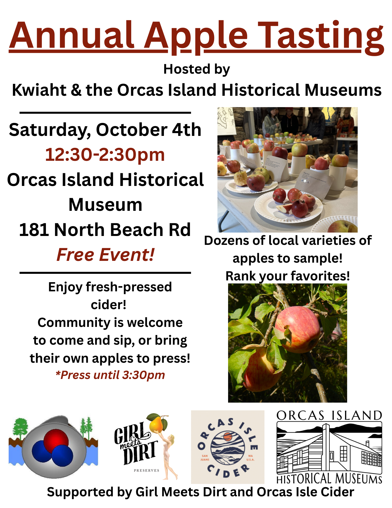 Kwiaht will be joining the Museum on Saturday, October 4th from 12:30-2:30pm. Come and sample dozens of varieties of local apples, enjoy fresh-pressed cider (courtesy of Girl Meets Dirt), and learn about Orcas Island’s heritage orchards. Apple tasting will end at 2:30, and we will be pressing apples until 3:30. The community is welcome to bring their apples to press, or enjoy ours!